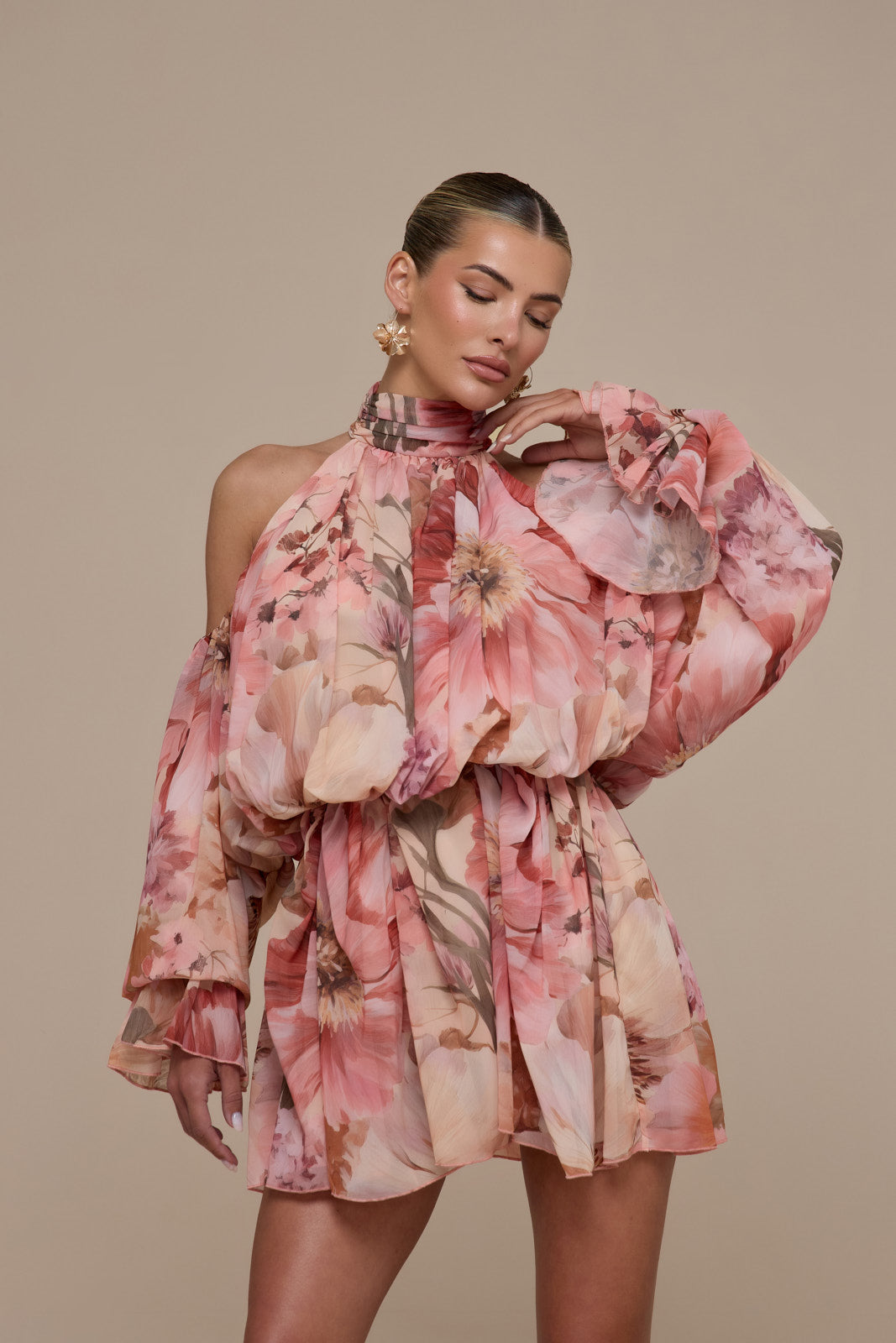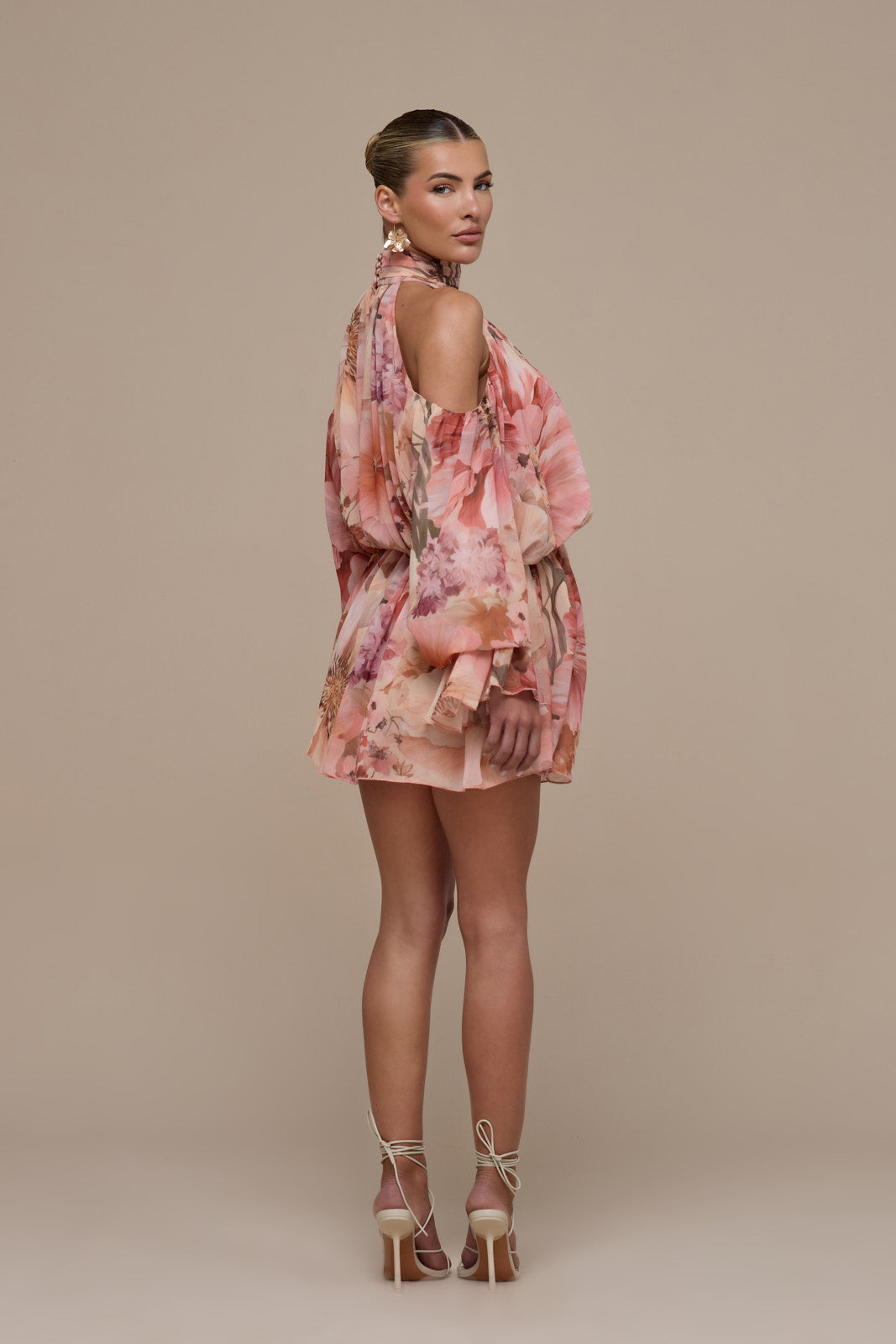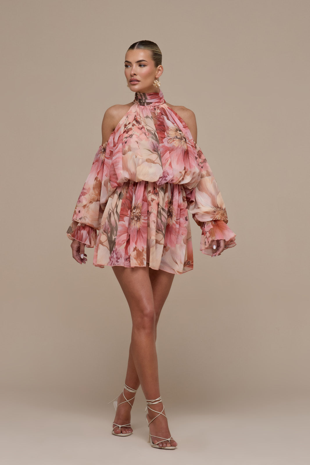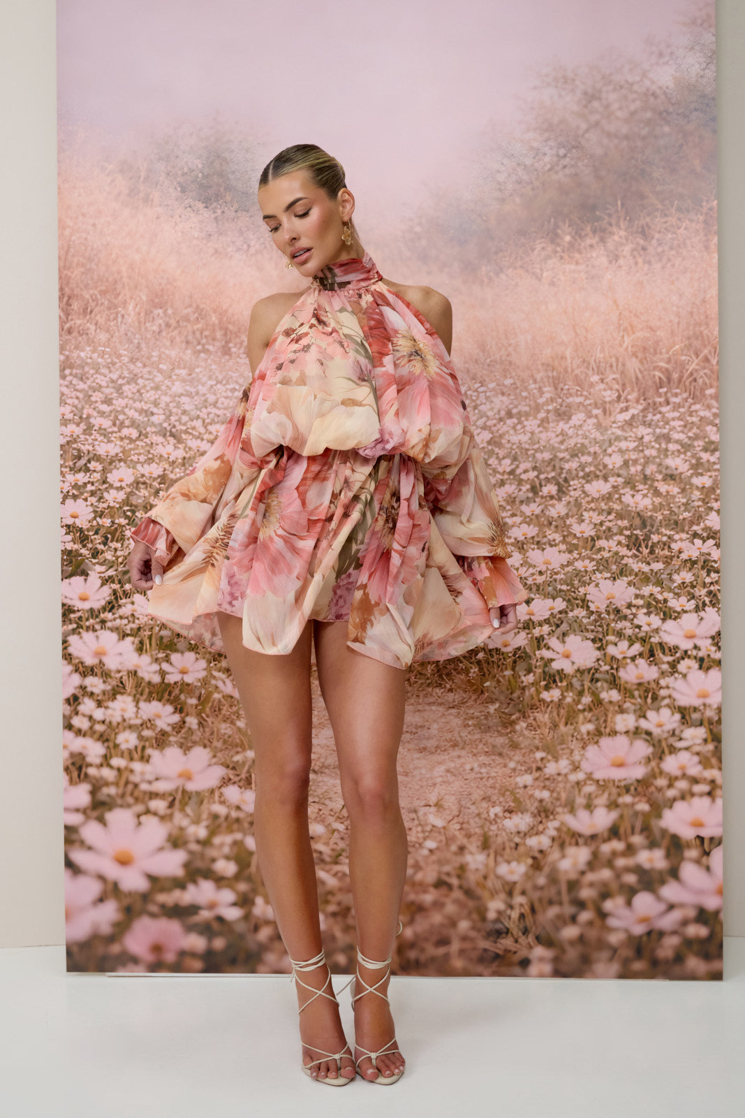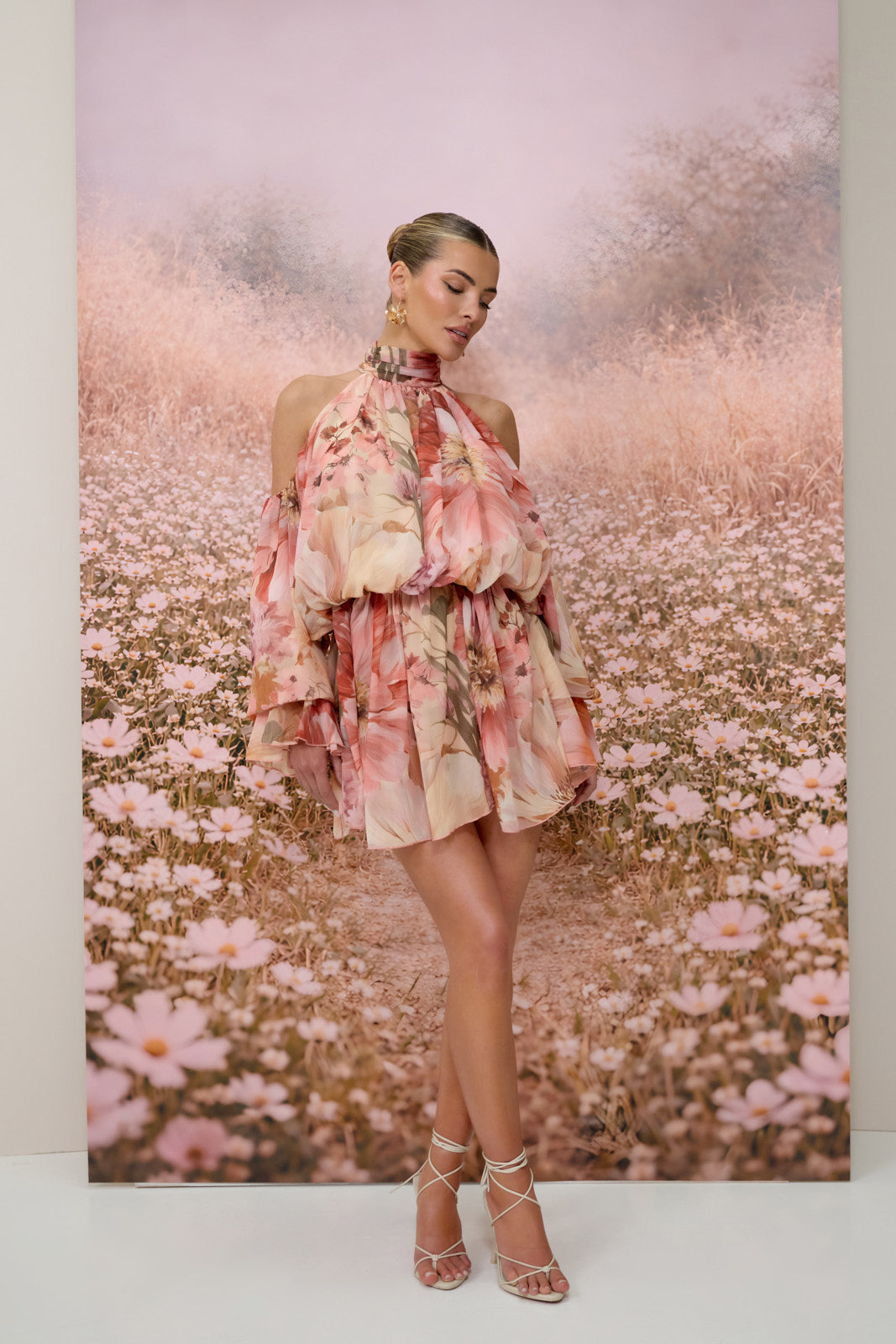 The softly draped bodice flows into a cinched elasticated waist that enhances the figure before falling into a light, airy mini skirt. Voluminous sleeves with elasticated cuffs add a romantic touch, balancing the silhouette with graceful movement.