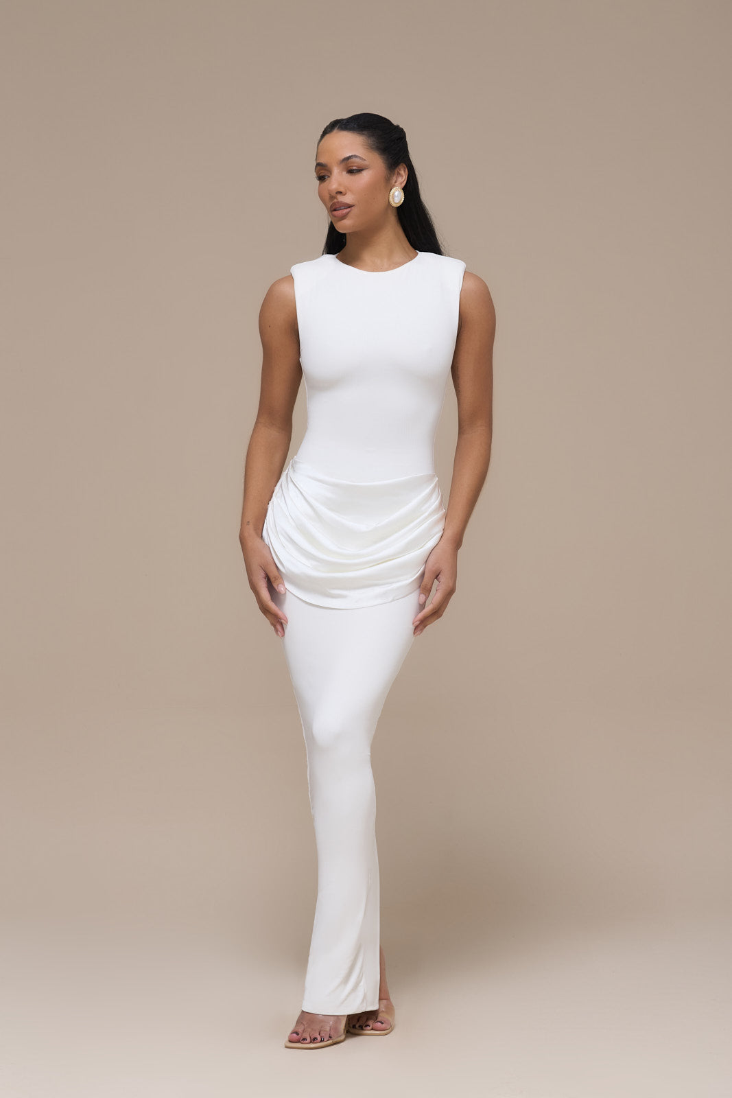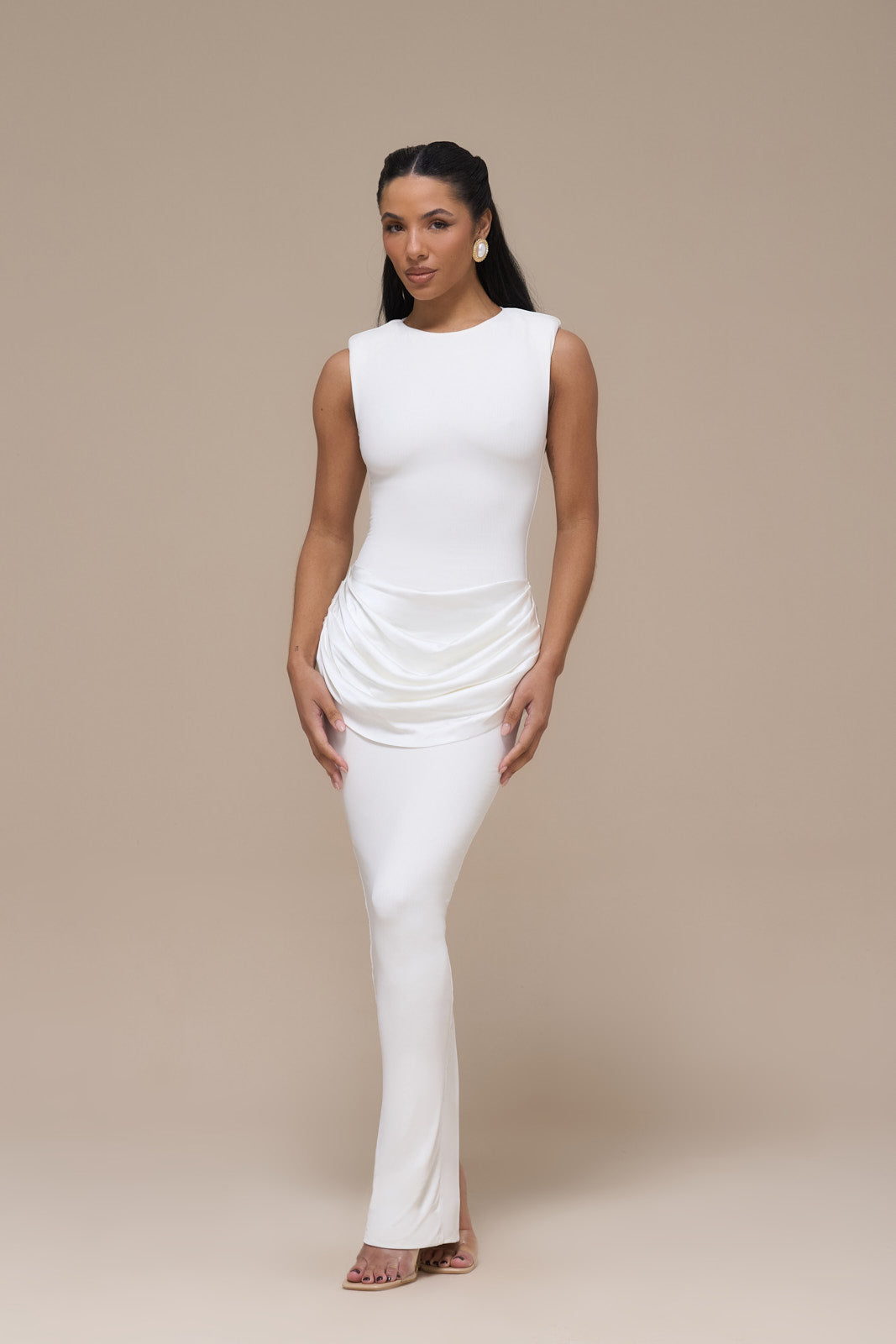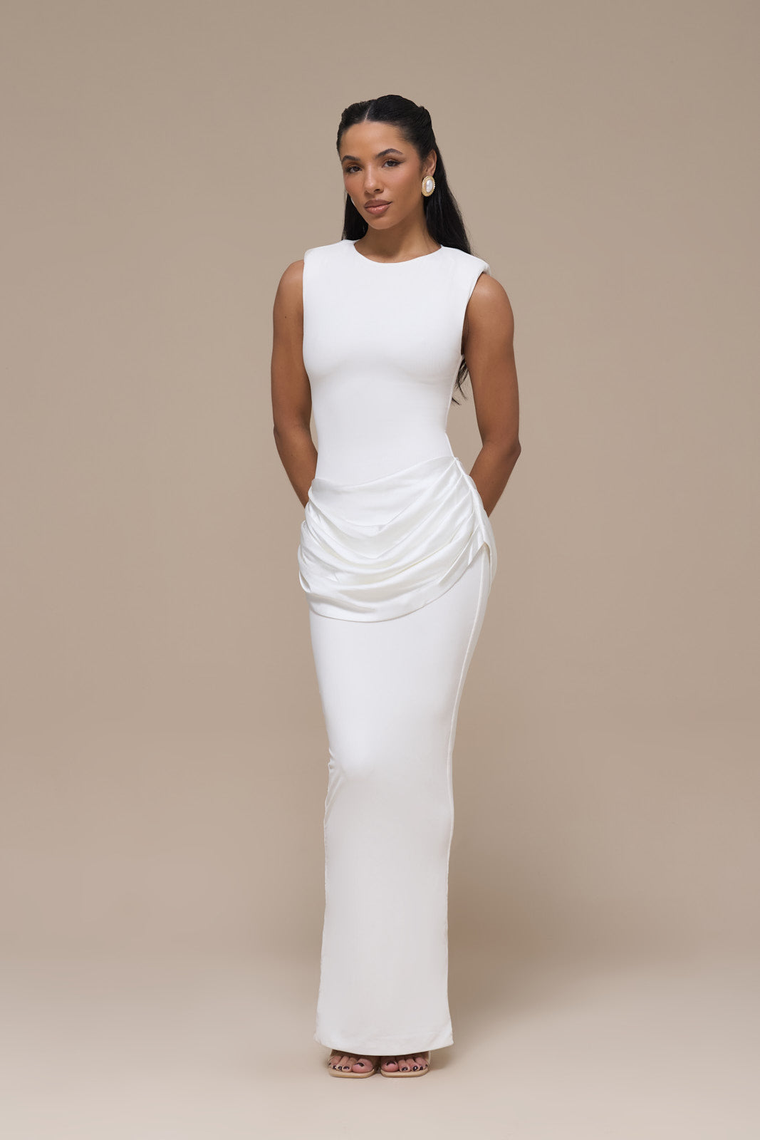 Model wearing Eman Satin Maxi Dress in White, front view highlighting sculpting fit and satin waist drape - Wanderdoll