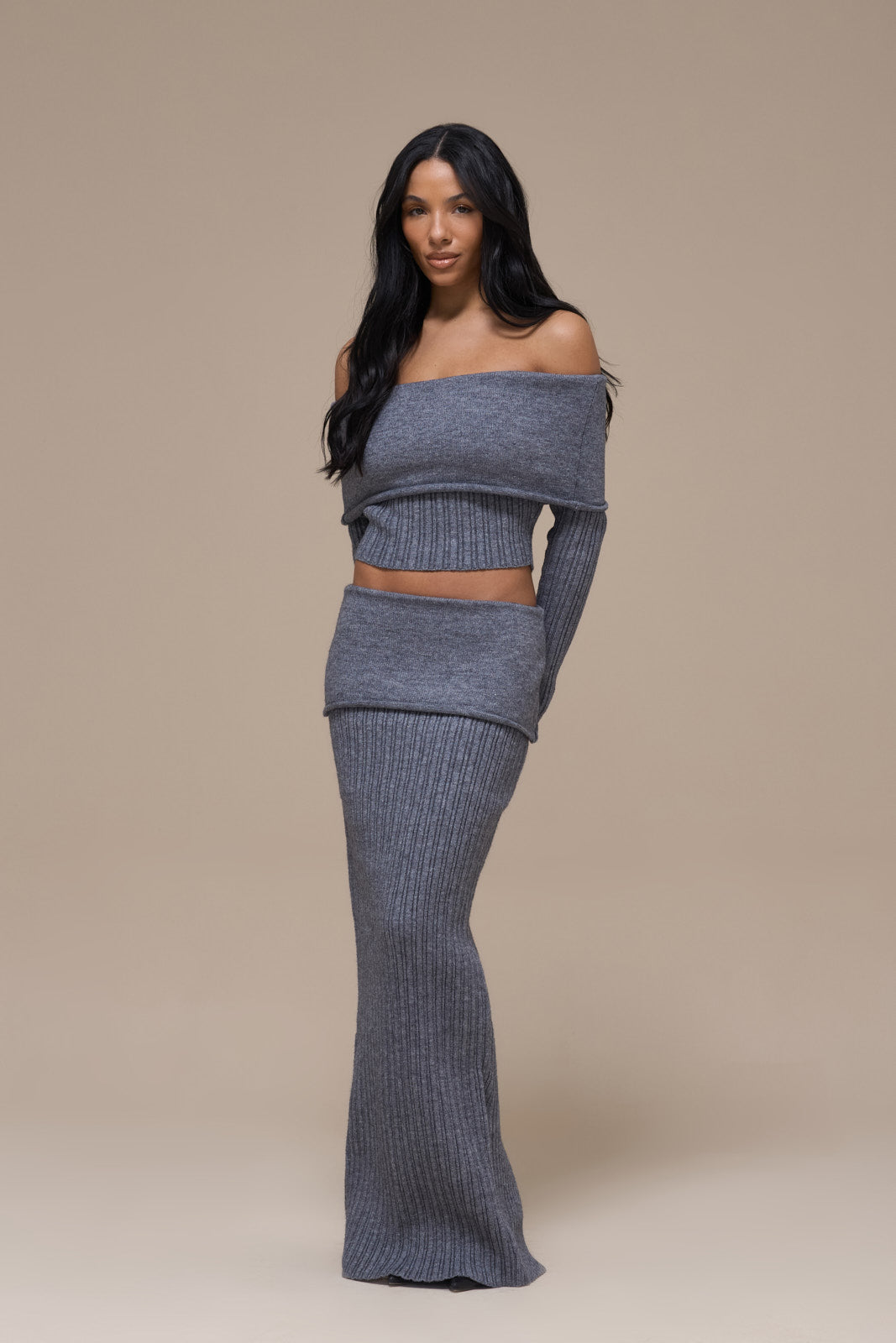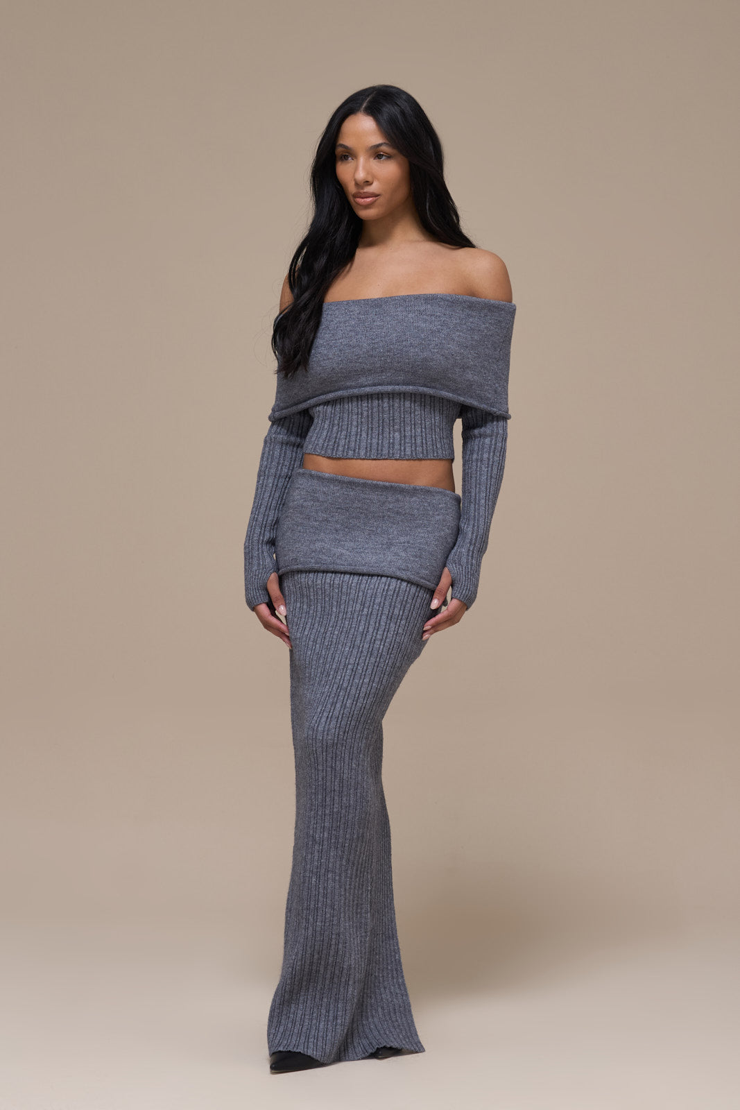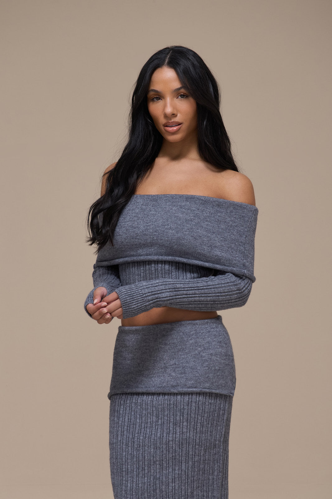 Crafted in a textured rib knit, the off-shoulder top features a gentle fold-over neckline with an elastic opening for a secure, flattering fit. Cropped and fitted through the sleeves, it balances ease with quiet structure.
