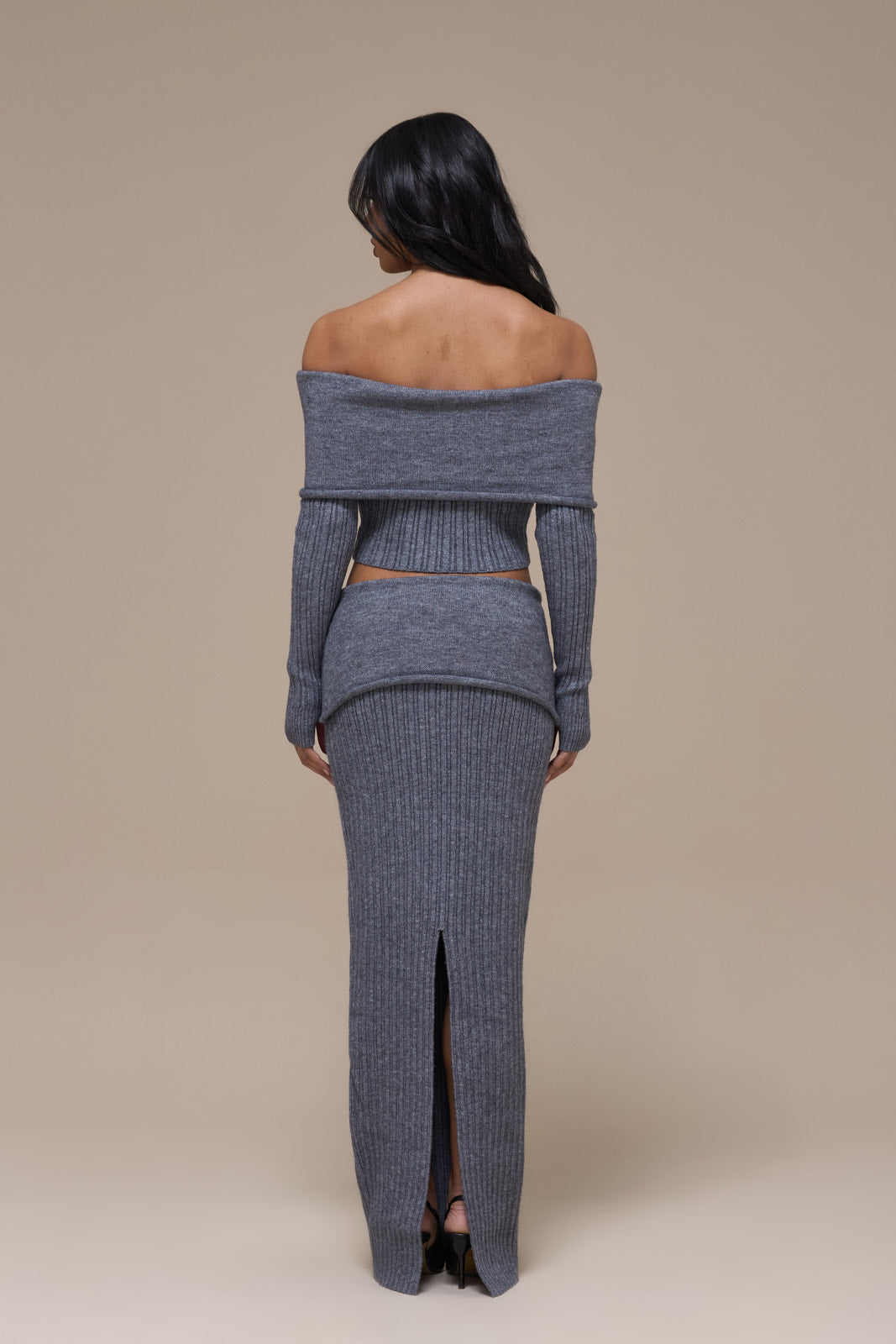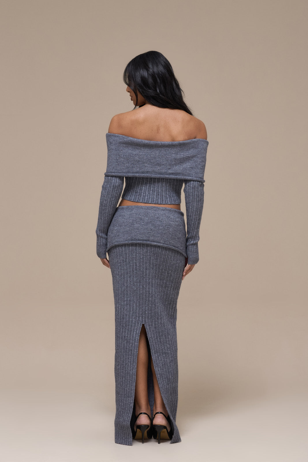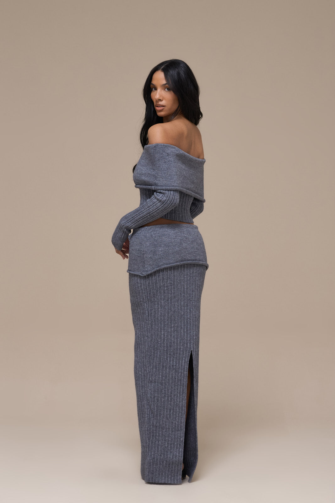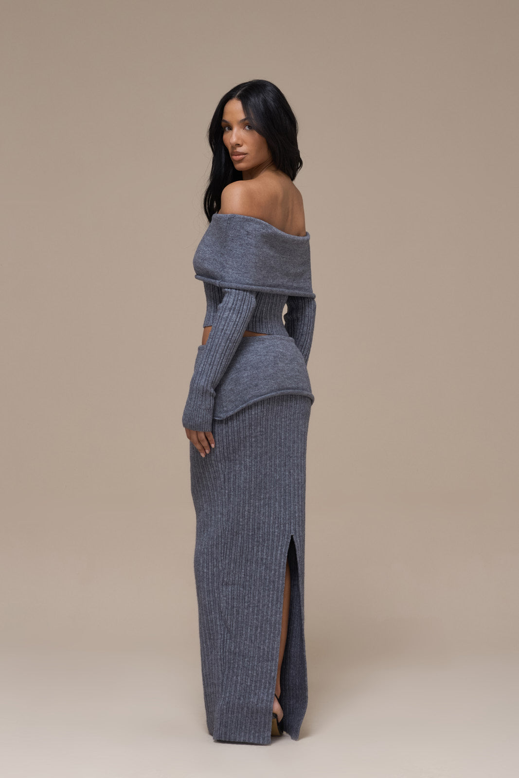 Crafted in a textured rib knit, the off-shoulder top features a gentle fold-over neckline with an elastic opening for a secure, flattering fit. Cropped and fitted through the sleeves, it balances ease with quiet structure.