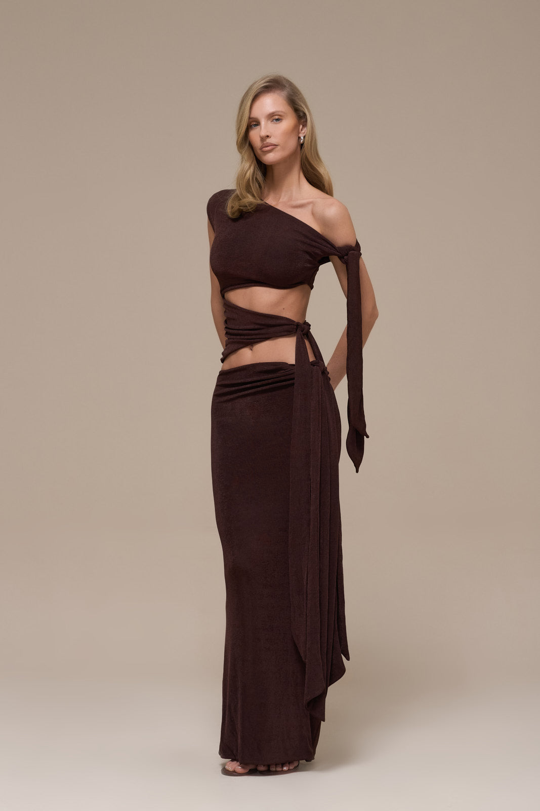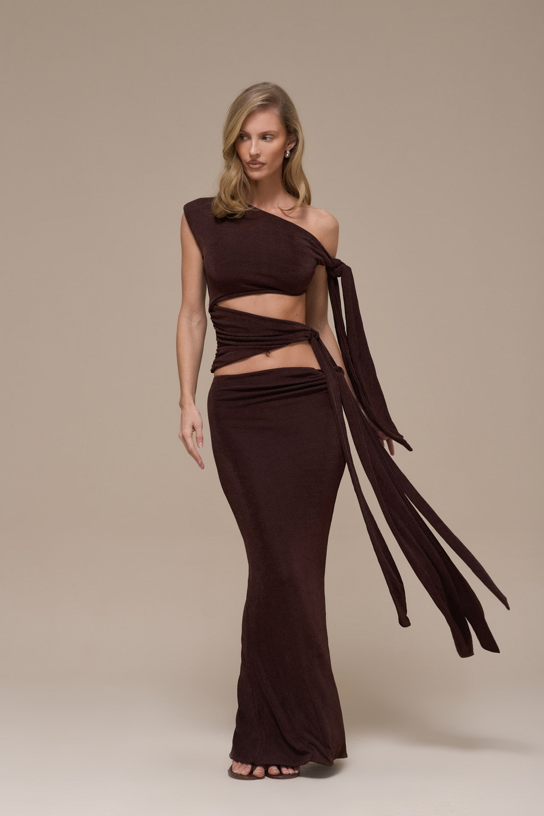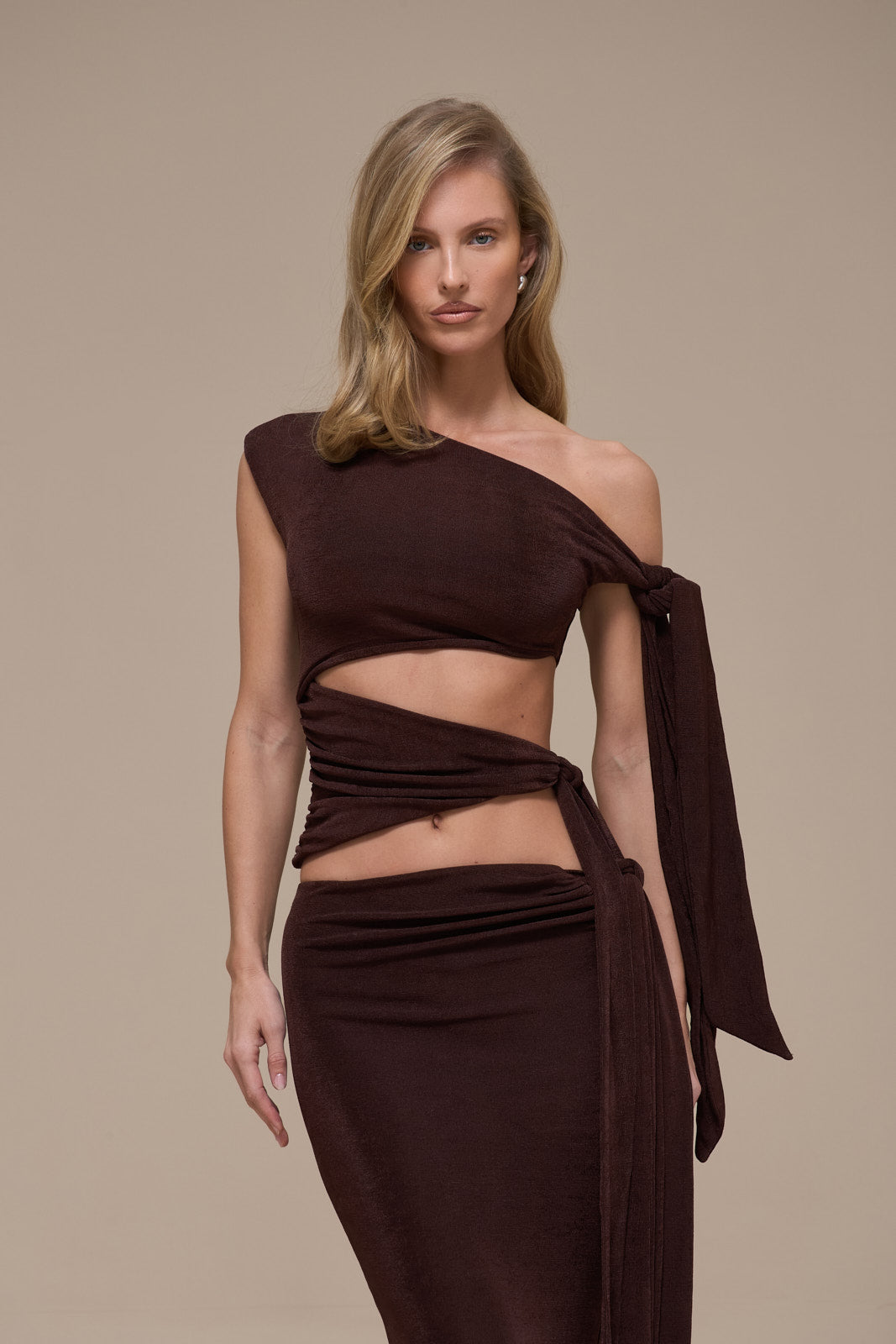 Crafted in double layer, silky soft cupro jersey, the Noa Cut Out Top feels as indulgent as it looks. In a soft, espresso hue it features a striking one-shoulder design that adds a modern edge to this wardrobe essential. With side tie detailing, creating effortless movement and a graceful silhouette.