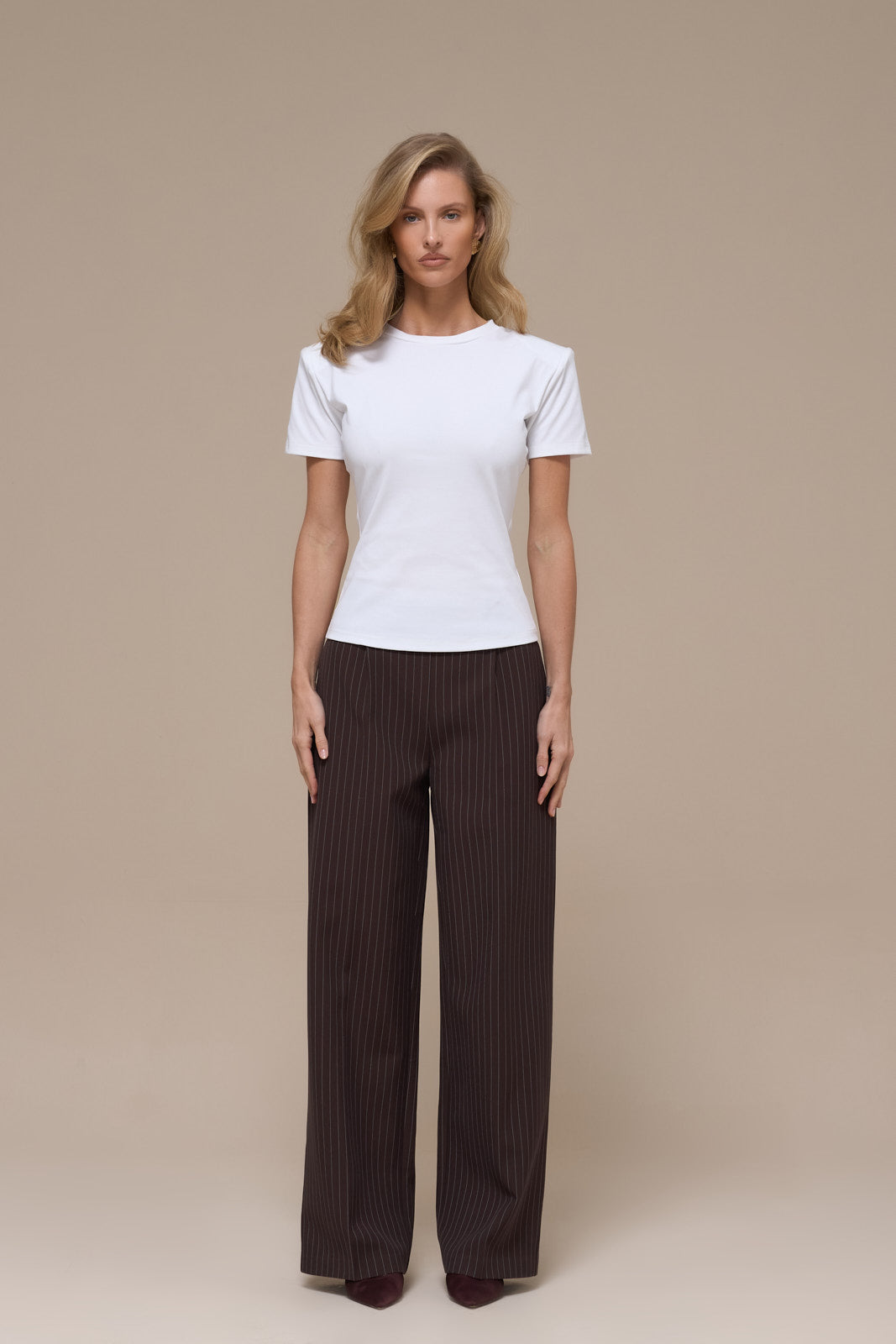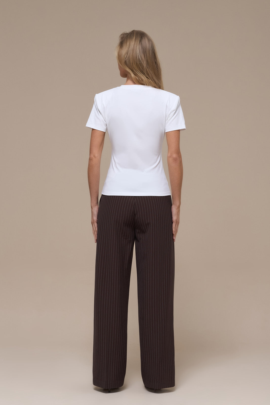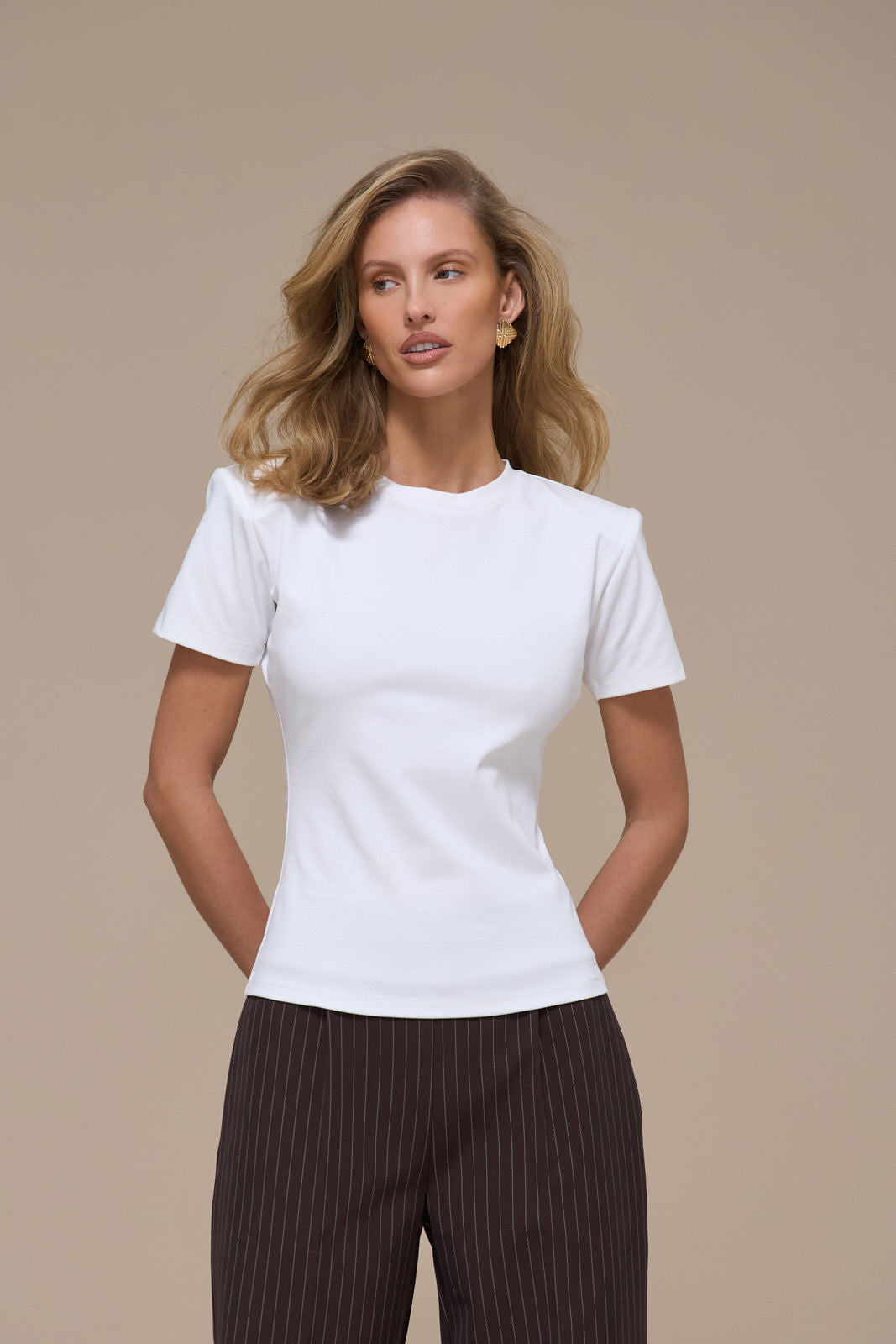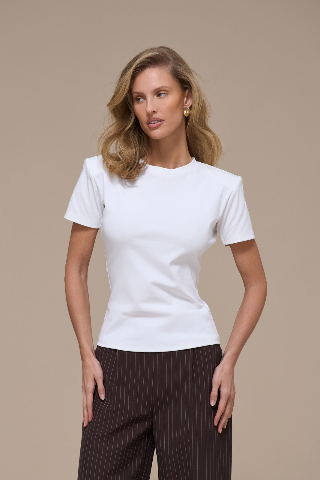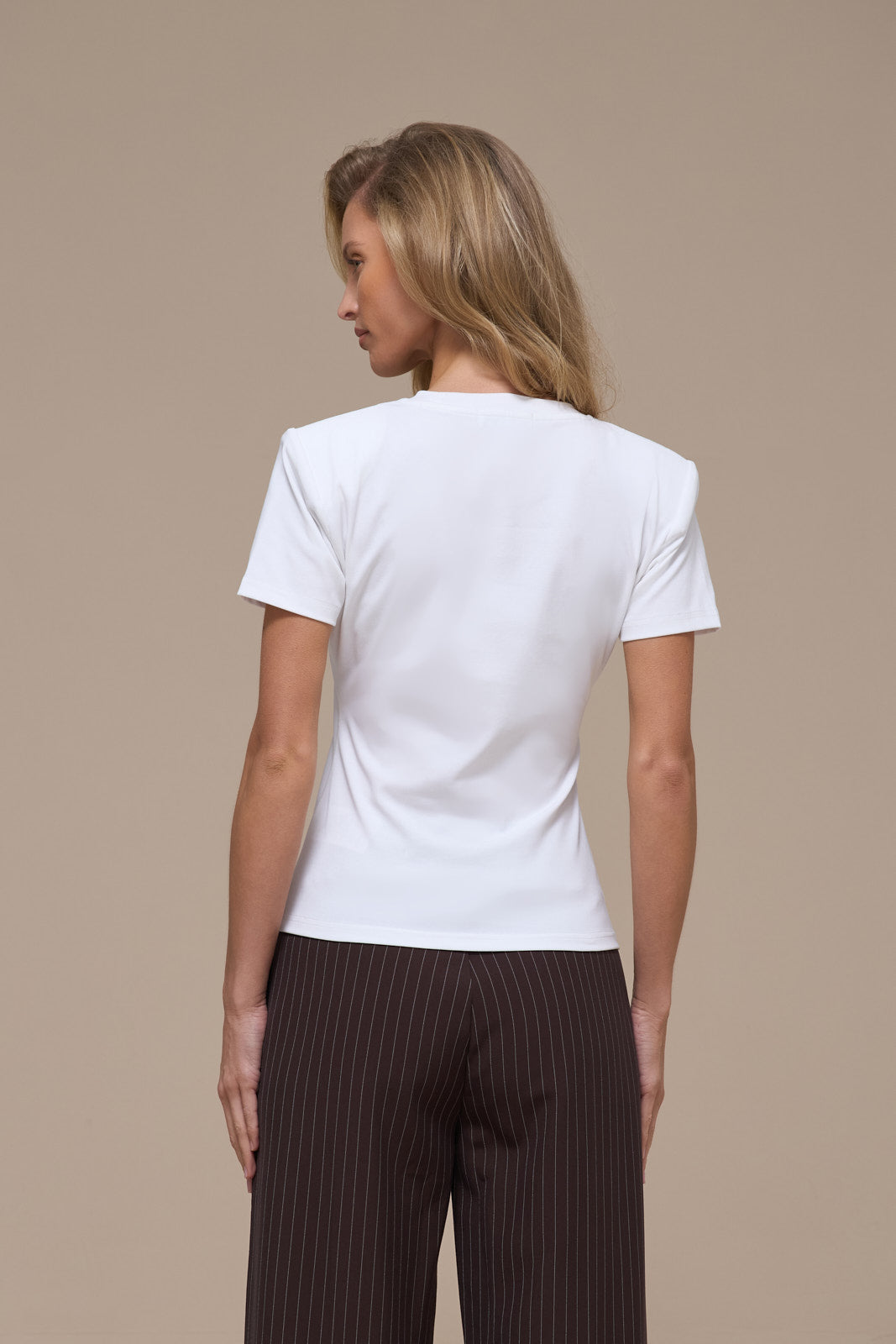 The Short Sleeve Basic T-shirt delivers a timeless silhouette with a modern edge. Featuring detachable shoulder pads that let you customise your look. Keep them in for added structure or remove them for a relaxed, classic fit.