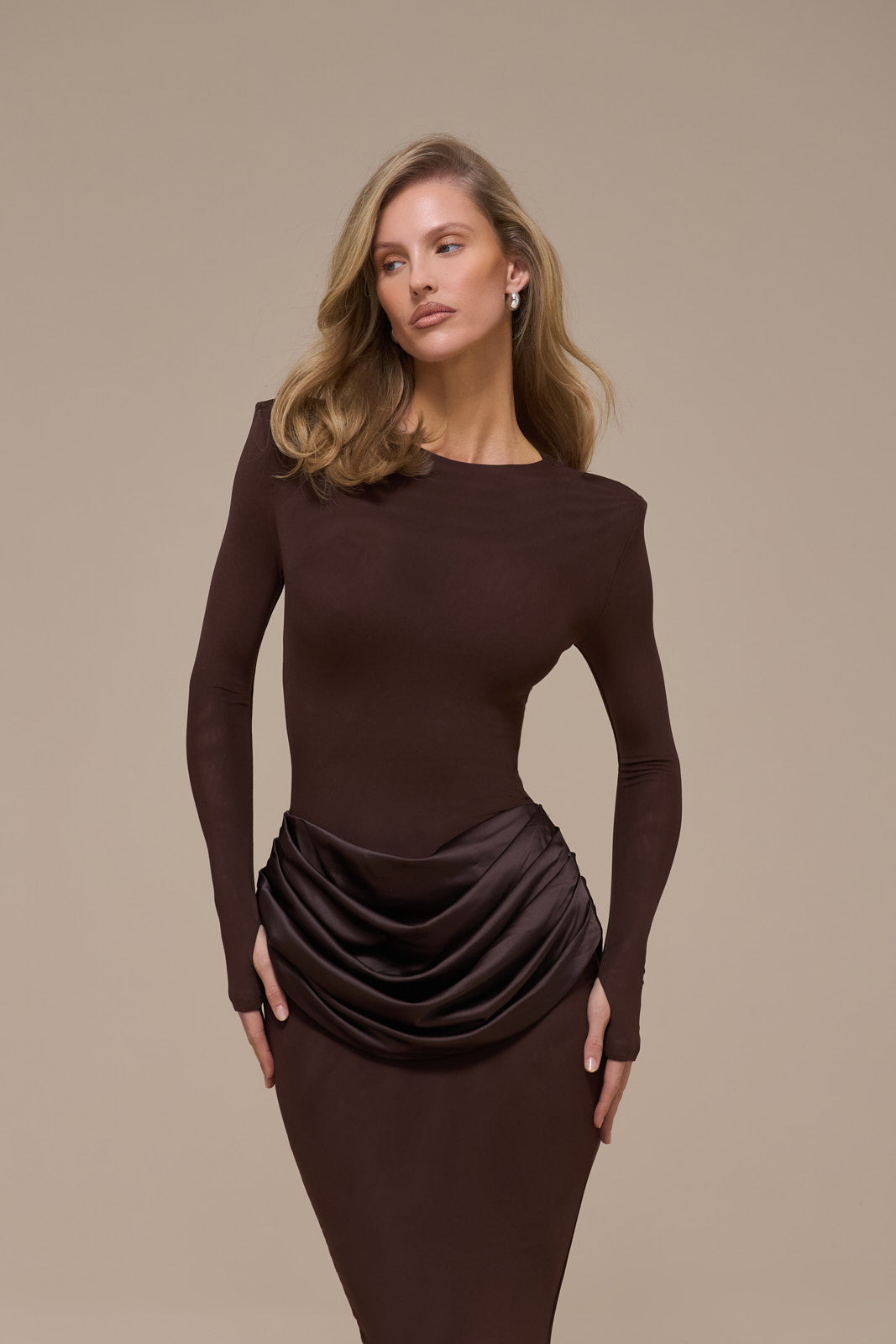 With fitted shoulder pads and a satin drape panel cinching the waist, she’s effortlessly flattering from every angle. Finished in warm, chocolate hue, she’s the kind of piece you’ll keep coming back to.