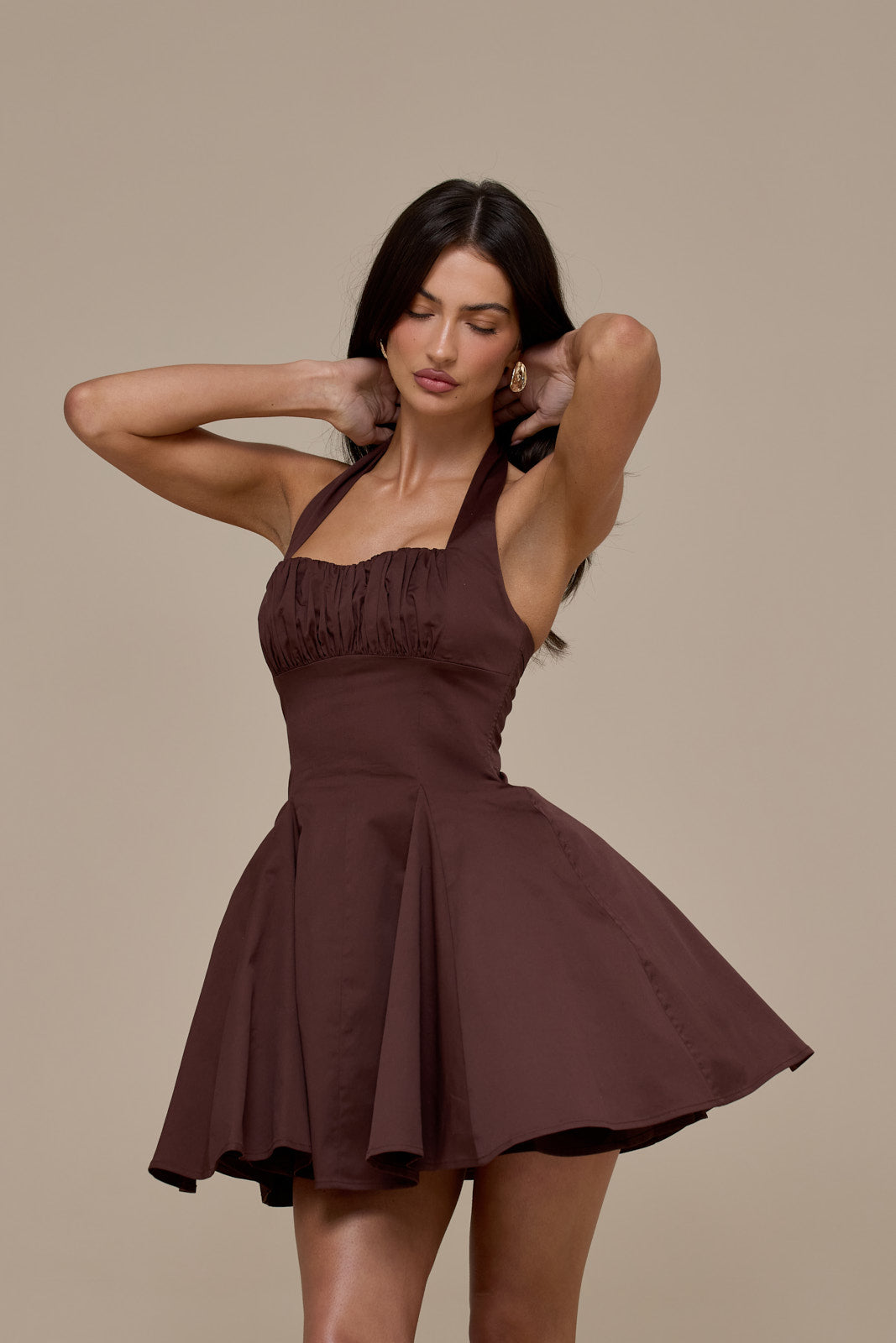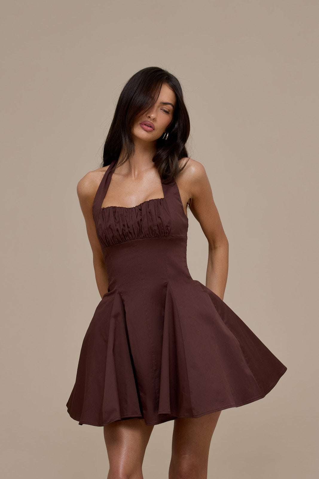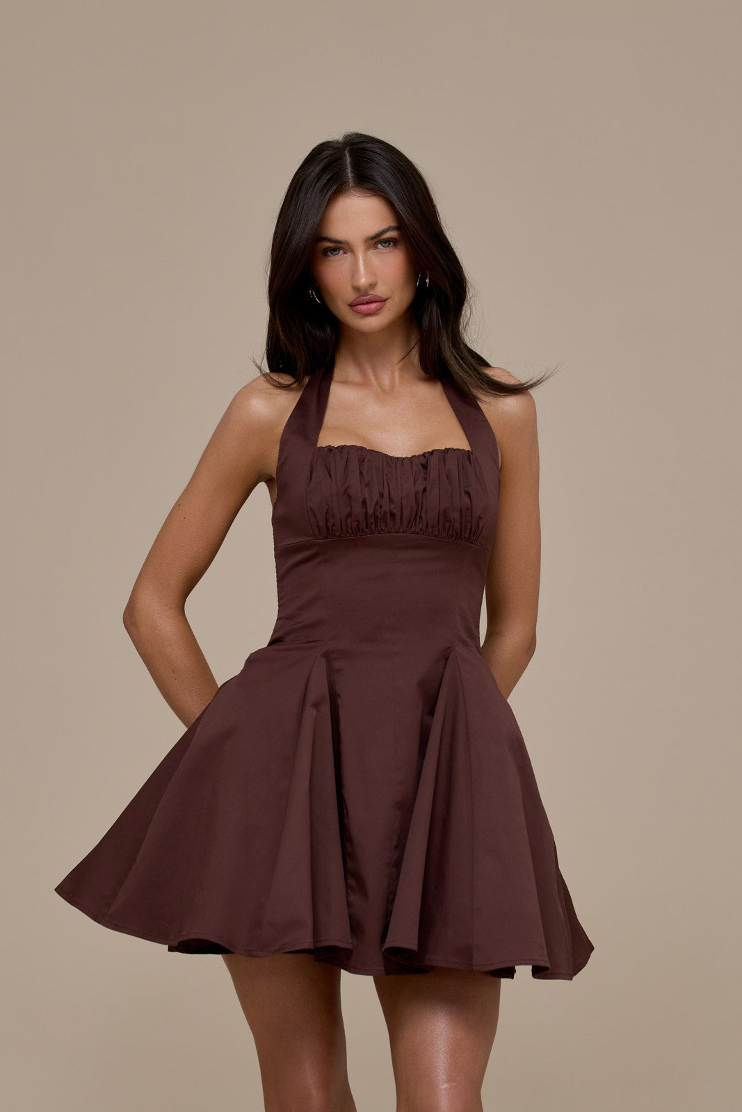 MARILYN HALTER NECK MINI DRESS | CHOCOLATE BROWN