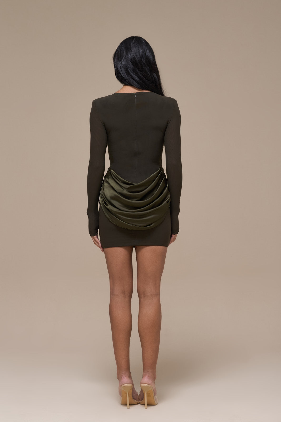 With sharp shoulder pads, a waist-defining satin drape panel, and long sleeves for balance, Storm is all about powerful proportions. Finished in a khaki hue, she’s your go-to for Autumn / Winter nights.